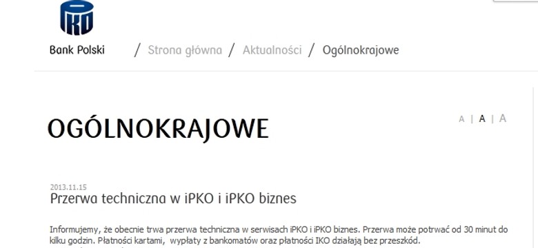 awaria Newsletter Drukuj Skopiuj link Zgłoś błąd na stronie awaria Prezydent Warszawy wycofuje z torów warszawskiego metra pociągi Inspiro 17 listopada 2013, 21:14 Inspiro na razie zjeżdżają z torów warszawskiego metra. Pociągi zostaną wycofane - zapowiedziała prezydent stolicy Hanna Gronkiewicz Waltz. "Maszynista musi dojechać do stacji. Taka procedura" 17 listopada 2013, 19:16 "Gdyby doszło do zagrożenia pożarowego czy wybuchowego maszynista musi za wszelką cenę dojechać do najbliższej stacji. Stamtąd rozpoczyna się ewakuację pasażerów. To najbardziej optymalne rozwiązanie" - mówił w rozmowie z TVP Info Adam Pietrzak, specjalista ratownictwa medycznego, który brał udział w ćwiczeniach, dotyczących wypadków w tunelach metra. Kolejne problemy z bankowością elektroniczną w PKO BP 15 listopada 2013, 22:05 Utrudnienia z bankowością elektroniczną w PKO BP. Niedostępne są serwisy internetowe klientów - mówi Informacyjnej Agencji Radiowej Aneta Styrnik-Chaber z zespołu prasowego banku. Trwają prace nad ich przywróceniem, które mogą potrwać od 30 minut do kilku godzin. Awaria gazociągu średniego ciśnienia w wielkopolskiej Chociczy 15 listopada 2013, 21:55 Kolejne awaria gazociągu w Wielkopolsce. Około 19.30 w miejscowości Chocicza doszło do uszkodzenia gazociągu średniego ciśnienia. Na miejsce wysłano 6 jednostek straży pożarnej, pogotowie gazowe i policję. Awaria sieci trakcyjnej w Warszawie. Tłumy na Centralnym i chaos komunikacyjny 15 listopada 2013, 20:22 Kilkudziesięciominutowe opóźnienia i tłumy oczekujące na pociągi, to skutki awarii sieci trakcyjnej, do której doszło po godz. 16 na stacji postojowej Warszawa-Grochów - informuje tvnwarszawa.pl . Reklama Zepsuty samochód? Zobacz, jak wygląda warsztat na czterech kółkach 12 listopada 2013, 13:25 Co kryje w środku żółta furgonetka, która przyjeżdża na ratunek zepsutego auta? Na pokładzie jest ponad 150 różnych narzędzi, w tym diagnostycznych, uniwersalnych dla wszystkich marek samochodów. Polski dreamliner znów się popsuł. "Drobny problem techniczny" 5 listopada 2013, 20:44 Samolot miał lecieć z Bangkoku do Warszawy. Nie wystartował - na lotnisku w stolicy Tajlandii polski dreamliner miał awarię zasilania. Awaria Facebooka? Postów nie dodasz 21 października 2013, 14:59 Prace konserwacyjne na Facebooku rozzłościły internautów. Okazuje się, że choć można na portal społecznościowy się zalogować, to można wrzucić żadnych linków, czy zmienić swego statusu Potężna awaria. Część Warszawy straciła prąd 13 października 2013, 10:10 Uszkodzone dwa kable i 61 podstacji wyłączyły warszawskie Bródno. Na całym osiedlu wysiadł prąd. Szpital Bródnowski na szczęście miał zasilanie awaryjne. Dreamliner znowu się popsuł. Tym razem nie działały toalety 10 października 2013, 09:16 To najbardziej pechowe maszyny ostatnich lat. Dreamlinery znów się popsuły. Tym razem maszyna japońskich linii lotniczych musiała wrócić na lotnisko, bo zepsuły się toalety. Reklama Ledwie wyjechał, a już się zepsuł. Awaria pociągu metra w Warszawie 7 października 2013, 16:52 Wczoraj wyjechały po raz pierwszy na tory, a dziś już awaria. O koło godziny 7 na stacji Kabaty stanął najnowszy Siemens Inspiro. Co ciekawe, pociąg został w przyspieszonym tempie dopuszczony do jazdy na torach. Awaria dreamlinera. Maszyna nie poleciała do Chicago 4 października 2013, 15:58 Nowe problemy polskich dreamlinerów. Komputer pokłądowy maszyny, która miała polecieć do Chicago zasygnalizował awarię i LOT musiał maszynę uziemić. Jednak komputer polskiego dreamlinera zasygnalizował awarię Dreamlinery znów uziemione. "Zapaliły się kontrolki..." 19 września 2013, 16:52 Dwa dreamlinery należące do LOT nie wyleciały dzisiaj do Pekinu i Nowego Jorku. W środę odwołano lot do Chicago - podaje RMF FM. System w samolotach zasygnalizował awarię, ale LOT nie ujawnia o jaką usterkę chodzi. PKO BP pod ostrzałem. Po awarii z kont zaczęły znikać pieniądze 12 września 2013, 09:59 Wielkie problemy klientów PKO BP, a jeszcze większe banku. Po weekendowej zmianie systemu informatycznego obsługującego konta Inteligo zaczęły się dziać przedziwne rzeczy. Gazeta.pl doniosła o znikających z kont pieniądzach i trudnościach w kontrolowaniu transakcji. Nowe samochody mają więcej defektów niż myślisz! NOWY raport ujawnia prawdę 22 sierpnia 2013, 15:04 W pierwszym półroczu 2013 r., jedna na dziesięć przebadanych części samochodowych w Polsce, była wadliwa i została wycofana z procesu produkcji - tak wynika z najnowszego raportu przygotowanego na podstawie wewnętrznych danych Exact Systems, firmy kontrolującej jakość w przemyśle motoryzacyjnym. W tym samym czasie, w wyniku wykrycia niesprawnych części w autach, firmy motoryzacyjne wezwały do kampanii naprawczych ponad 72 tysiące pojazdów. Fukuszima znów truje. Wyciekły setki ton toksycznej wody 20 sierpnia 2013, 10:49 Toksyczna woda wyciekła ze specjalnego zbiornika w elektrowni w Fukuszimie. Zdaniem japońskich ekspertów dawka promieniowania przekroczyła roczną dopuszczalną dawkę dla człowieka. Paraliż na kolei. Stanęło kilkadziesiąt pociągów w całym kraju 8 sierpnia 2013, 19:28 Duże utrudnienia na kolei. Zablokowana jest trasa pomiędzy Warszawą a Krakowem na odcinku pomiędzy miejscowościami Tunel i Miechów w Małopolsce. Doszło tam do awarii sieci trakcyjnej. Z powodu upałów kolej zamyka kolejne odcinki tras 7 sierpnia 2013, 14:49 Kilkadziesiąt zgłoszeń dziennie i co najmniej kilka zamkniętych szlaków. Upały coraz bardziej dają się we znaki pasażerom korzystającym z kolei. "Nawet Chuck Norris im nie pomaga". Awaria w BZ WBK trwa kolejny dzień 1 sierpnia 2013, 18:07 Klienci narzekają, że awarie w tym banku zdarzają się często. Żartują nawet, że przynajmniej raz na rok system musi przestać działać, czasem - j