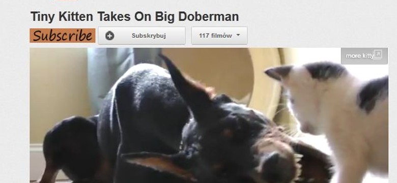 Ten mały kotek jest albo tak odważny, że nie straszne mu wielkie kły dobermana, albo tak głupiutki, że nie jest w stanie przewidzieć, co mogłoby go spotkać, gdyby psisko niechcący zatrzasnęło pysk. Tak czy inaczej, wideo pokazujące małego futrzaka zaczepiającego wielkiego psa robi wrażenia. Zobaczcie sami.