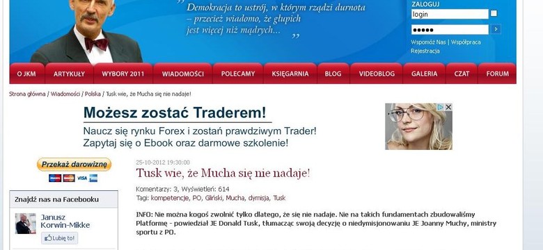 Nie można kogoś zwolnić tylko dlatego, że się nie nadaje. Nie na takich fundamentach zbudowaliśmy Platformę - taka wypowiedź Donalda Tuska znalazła się w serwisie "wiadomości" na stronie Janusza Korwin-Mikkego korwin-mikke.pl. Sęk w tym, że takie słowa nigdy nie padły, a "informacja" jest sygnowana przez serwis... wymyślający wiadomości.