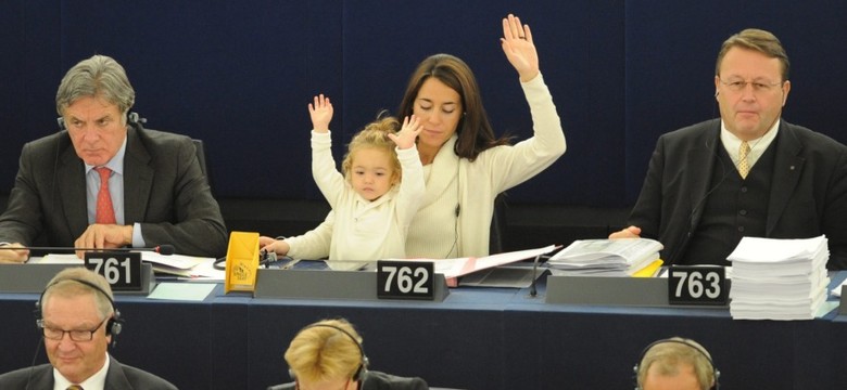 Głosowanie na trzy ręce: posłanka Parlamentu Europejskiego z córką na obradach