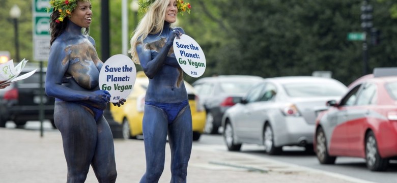 Zastanawiacie się czasami, jak wiele bylibyście skłonni zrobić dla szczytnej idei? Panie, których zdjęcia przedstawiamy, się nie zastanawiają - one bez chwili wahania zrzucają odzież, malują ciała i namawiają wszystkich, których napotkają, do bycia weganami i kochania Ziemi! Taki performance w wykonaniu dwóch aktywistek PETA mogli wczoraj oglądać mieszkańcy Waszyngtonu. Też chcielibyście to zobaczyć na żywo...?