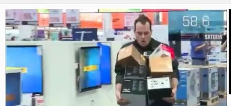 Darmowe zakupy to świetna sprawa, problem pojawia się jednak wówczas, gdy mamy na nie tylko 156 sekund. Ten mężczyzna w sklepie ze sprzętem RTV/AGD zdołał w takim czasie zgarnąć sprzęt o wartości niecałych 30 tys. euro. Zobacz, jaką obrał strategię.